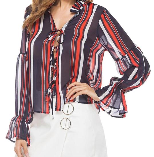 ouxiuli Women’s Fashion Slim Fit Striped Print Chiffon Long Sleeve Shirts Wine Red M, Wine Red, US Medium