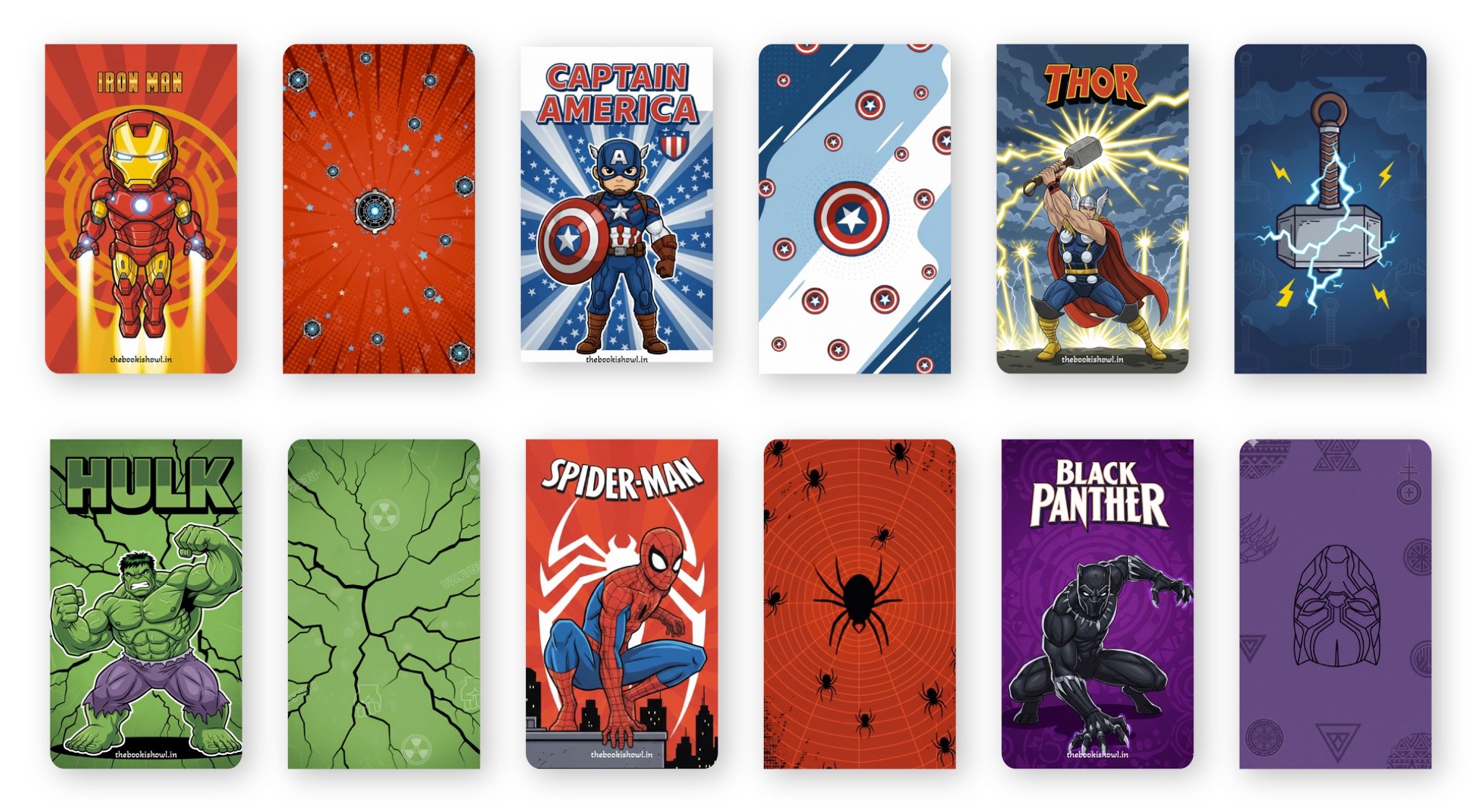 This premium collection features Marvel-inspired superhero artwork in bold comic style — powerful armor suits, shields, thunder gods, web-slingers, green rage heroes, and stealth warriors — brought to life with vibrant colors and dynamic designs.